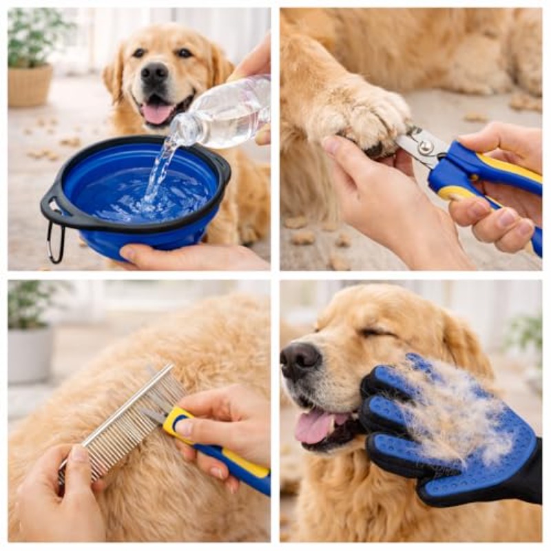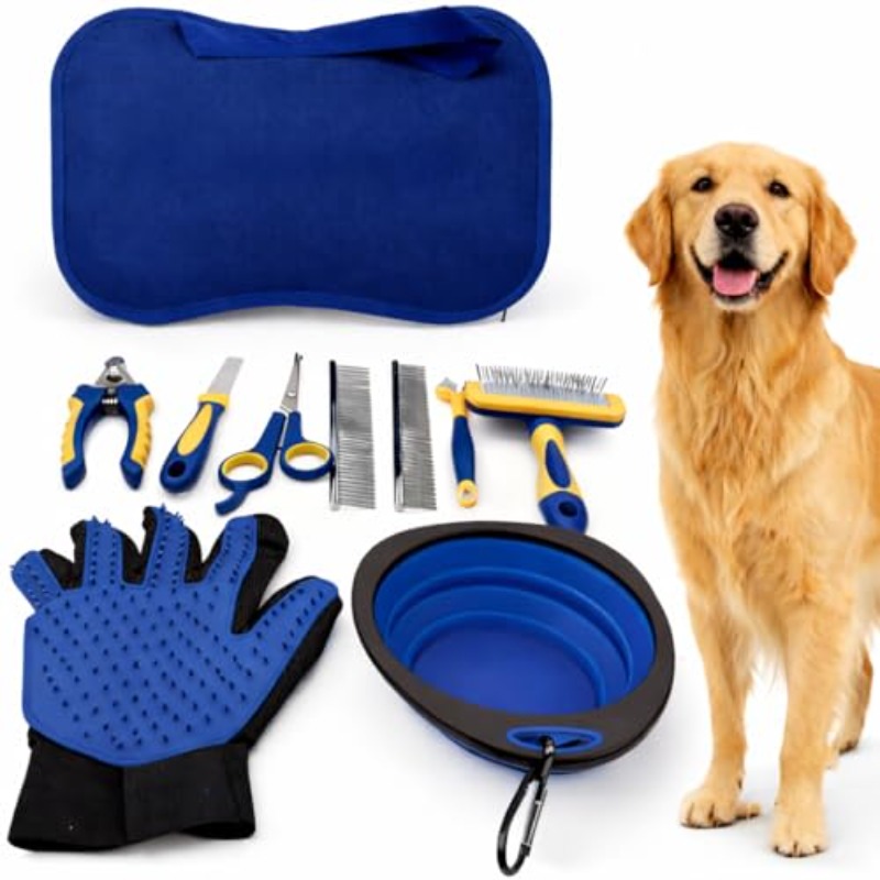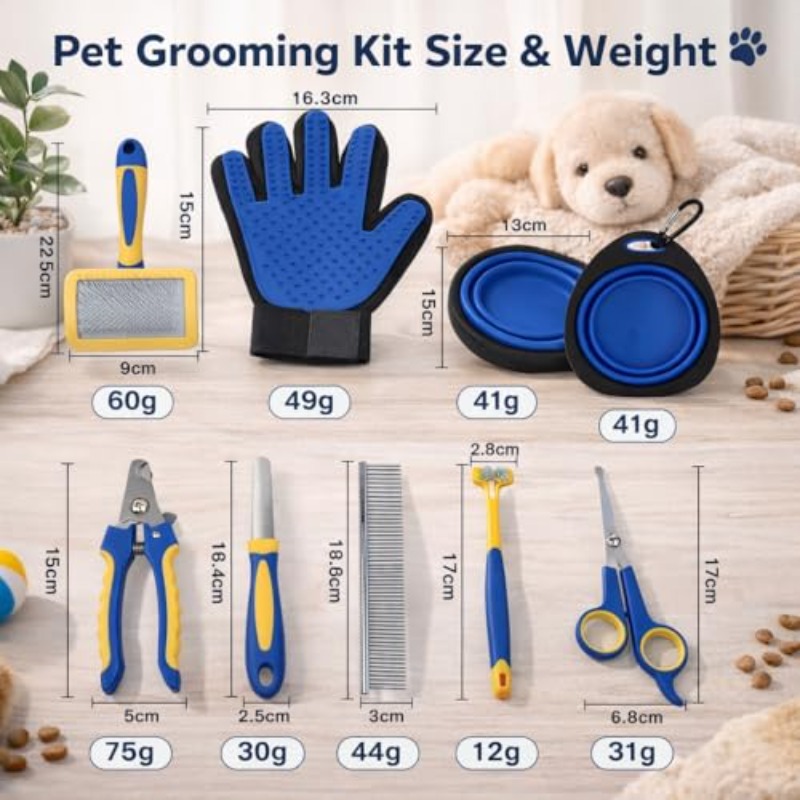 𝗢𝗣𝗔𝗟 𝗔𝗕𝗢𝗗𝗘 𝟴-𝗣𝗜𝗘𝗖𝗘 𝗚𝗥𝗢𝗢𝗠𝗜𝗡𝗚 𝗞𝗜𝗧 – Includes dog grooming scissors, curved grooming scissors, thinning shears, slicker brush, metal comb, grooming glove, nail clippers & collapsible bowl — complete grooming kit for dogs & cats in one zippered travel case. 𝗟𝗜𝗚𝗛𝗧𝗪𝗘𝗜𝗚𝗛𝗧 & 𝗗𝗨𝗥𝗔𝗕𝗟𝗘 𝗕𝗨𝗜𝗟𝗗 – Only 584g; easy to carry anywhere. Stainless steel blades are rust-resistant & long-lasting. No batteries needed. Ergonomic non-slip handles reduce han