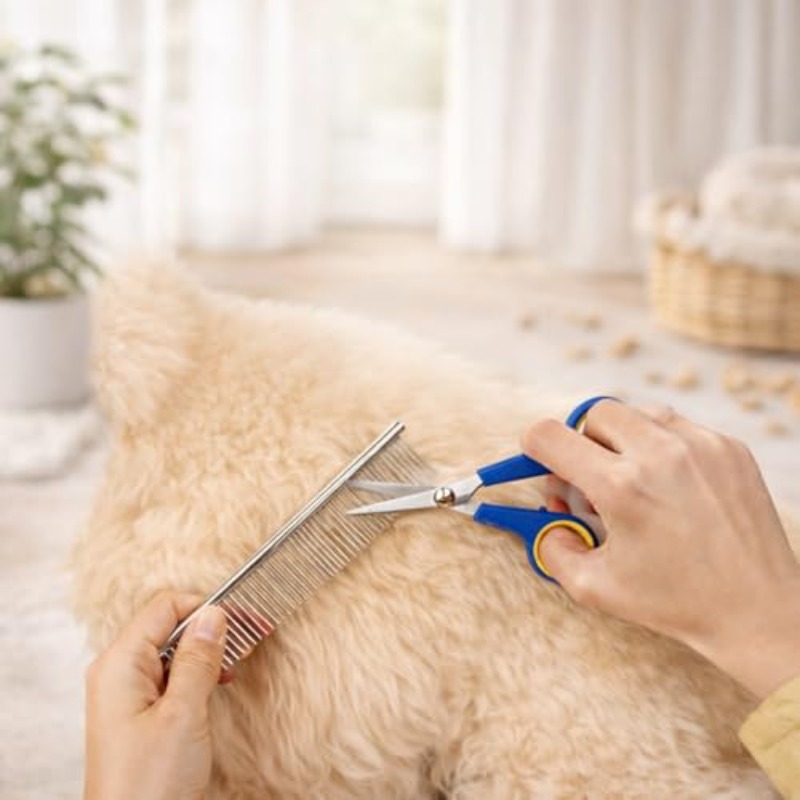 d fatigue during grooming sessions. 𝗦𝗔𝗟𝗢𝗡-𝗤𝗨𝗔𝗟𝗜𝗧𝗬 𝗖𝗨𝗧𝗦 𝗔𝗧 𝗛𝗢𝗠𝗘 – Curved scissors shape coats with precision. Thinning shears blend lines naturally for a smooth finish; perfect for poodles, doodles, thick coats & long-haired cats. Save money on professional grooming visits. 𝗦𝗔𝗙𝗘 & 𝗚𝗘𝗡𝗧𝗟𝗘 𝗙𝗢𝗥 𝗔𝗟𝗟 𝗣𝗘𝗧𝗦 – Safety-guard nail clippers prevent over-cutting — ideal for nervous & sensitive pets. Fine-tooth comb keeps ears clean & infection-free