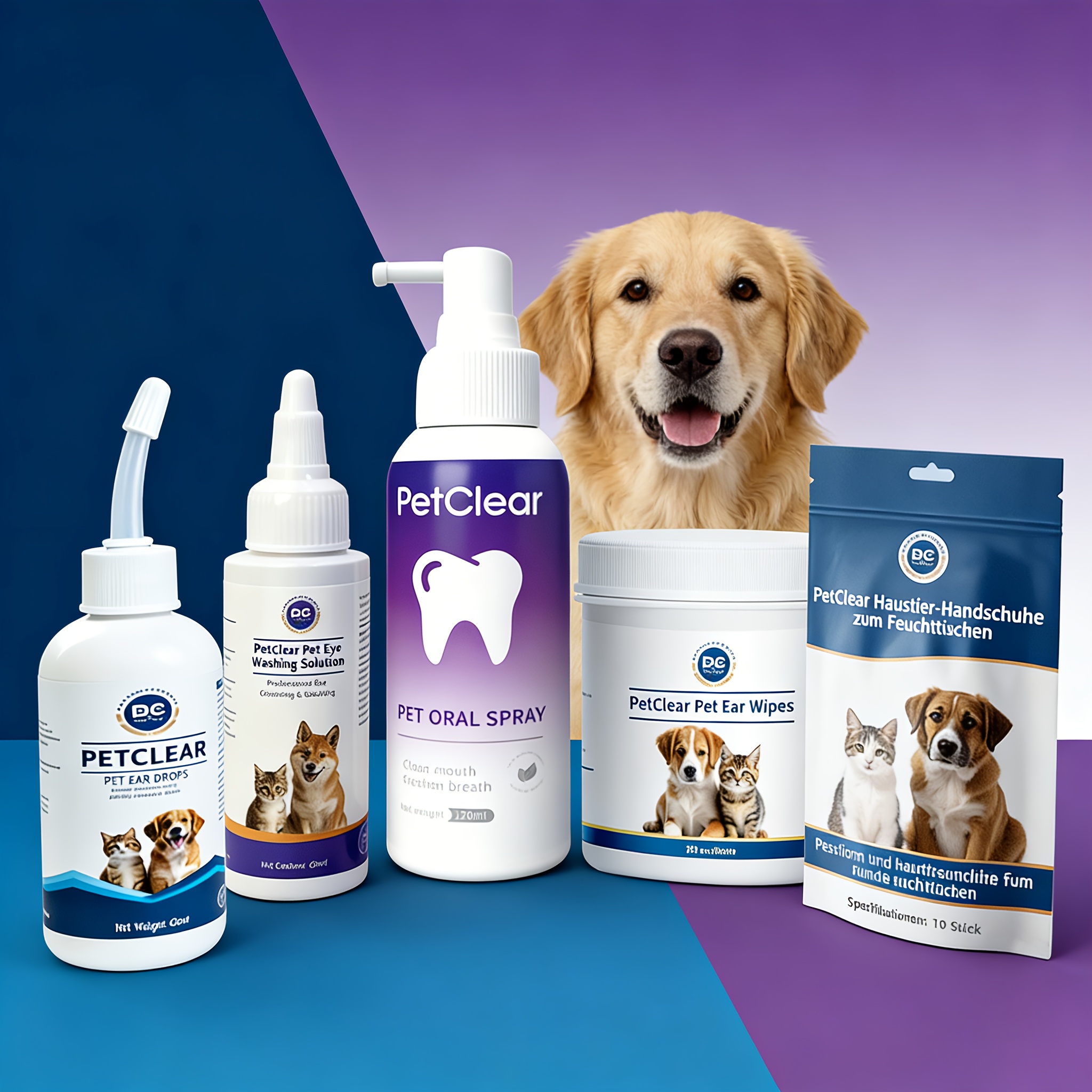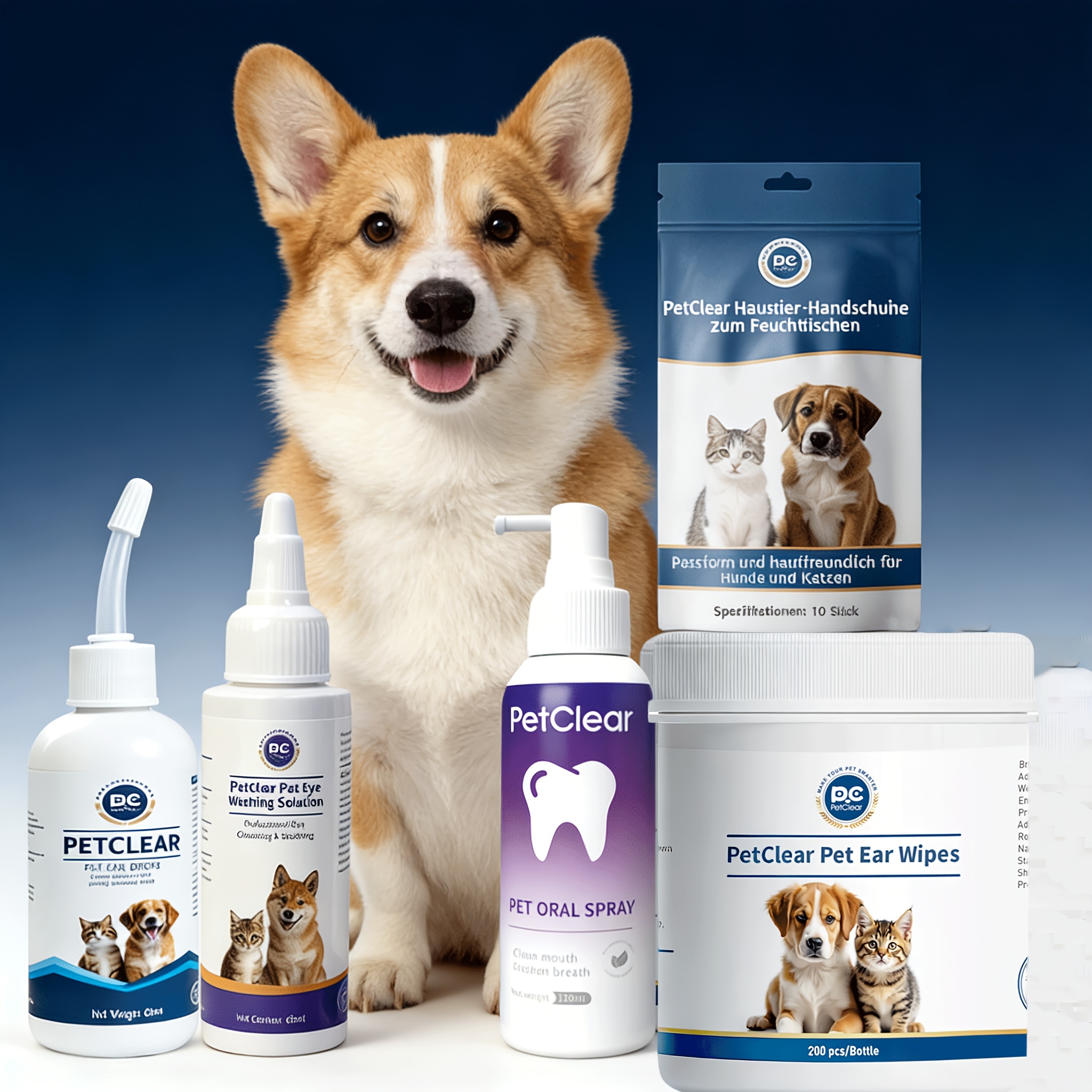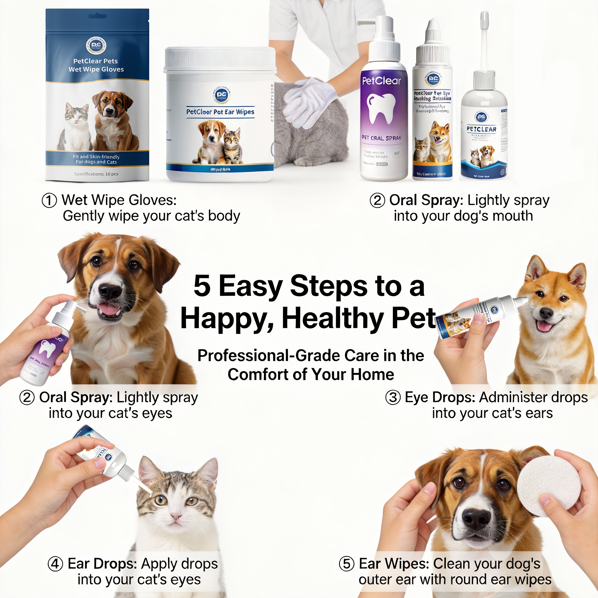 Shop NowPet Ear, Eye, and Oral Care Kit: Includes 1 Bottle of Ear Drops, Eye Wash Solution, Oral Spray, Ear Wipes, and Wet Wipe Gloves